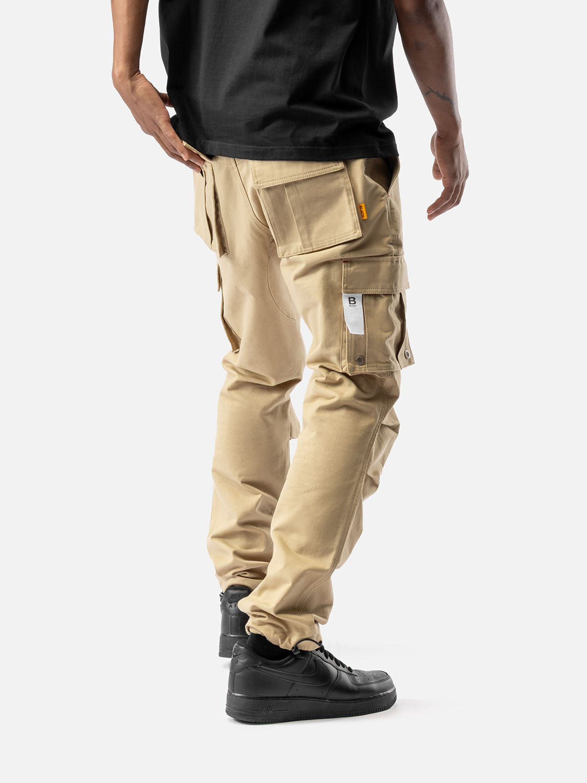 • Side view of khaki cargo pants with side pockets, ankle drawstrings, paired with a black t-shirt, and black sneakers.
