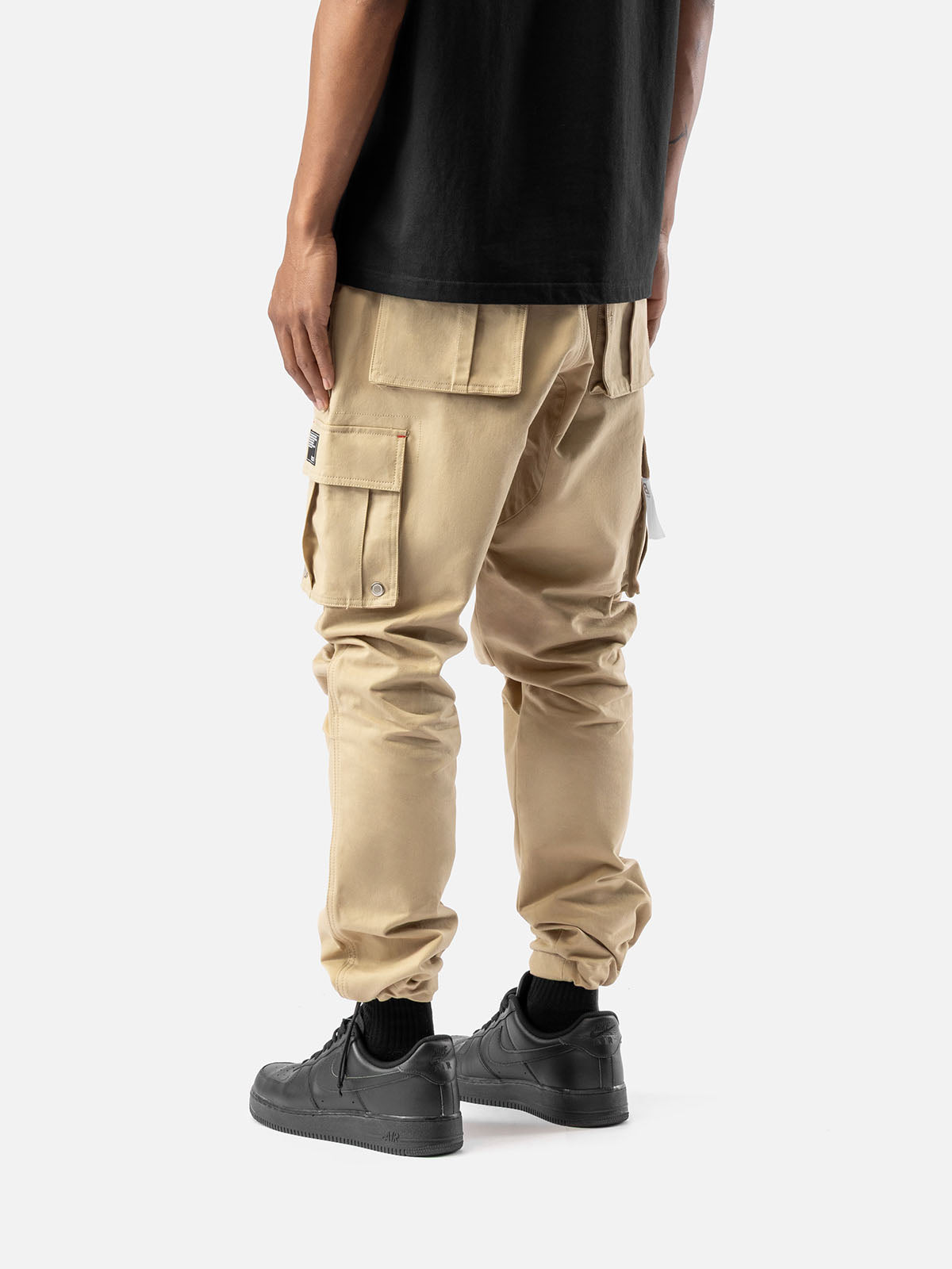 • Back view of khaki cargo pants with side pockets, ankle drawstrings, and simple back pockets, paired with a black t-shirt, and black sneakers.