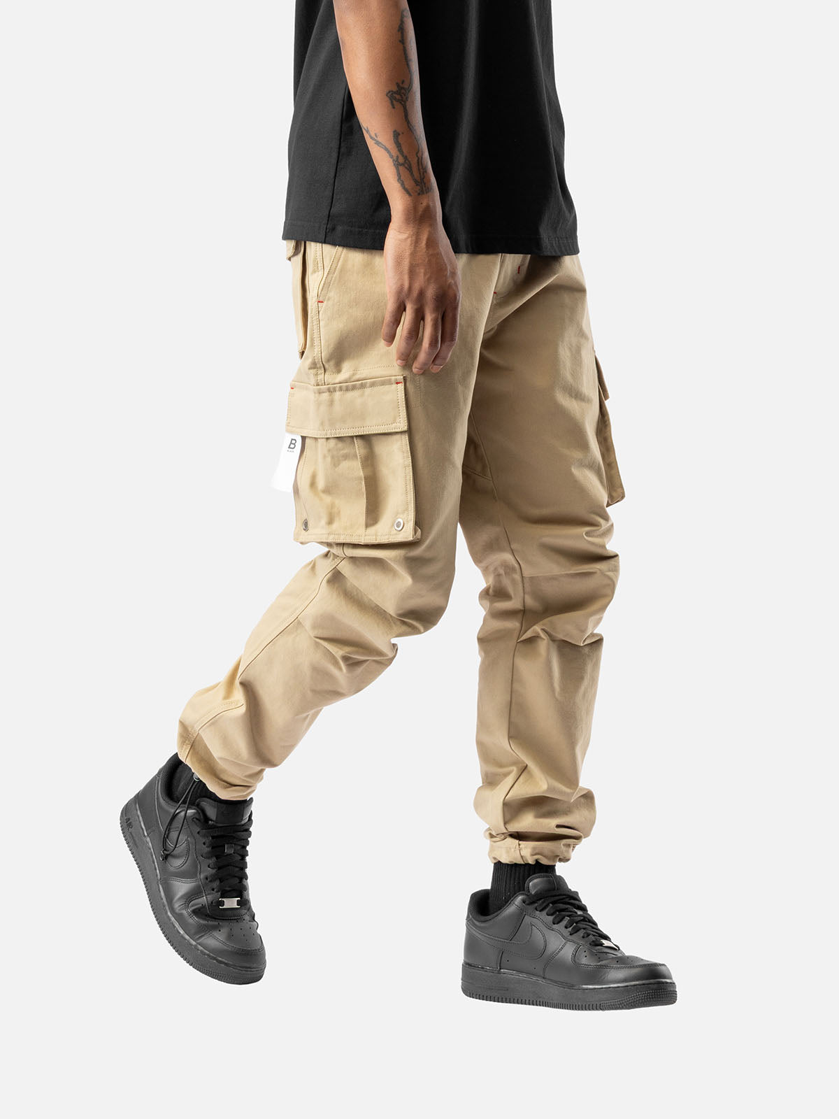 • Khaki cargo pants with side pockets, ankle drawstrings, paired with a black t-shirt, and black sneakers, showcasing streetwear style.