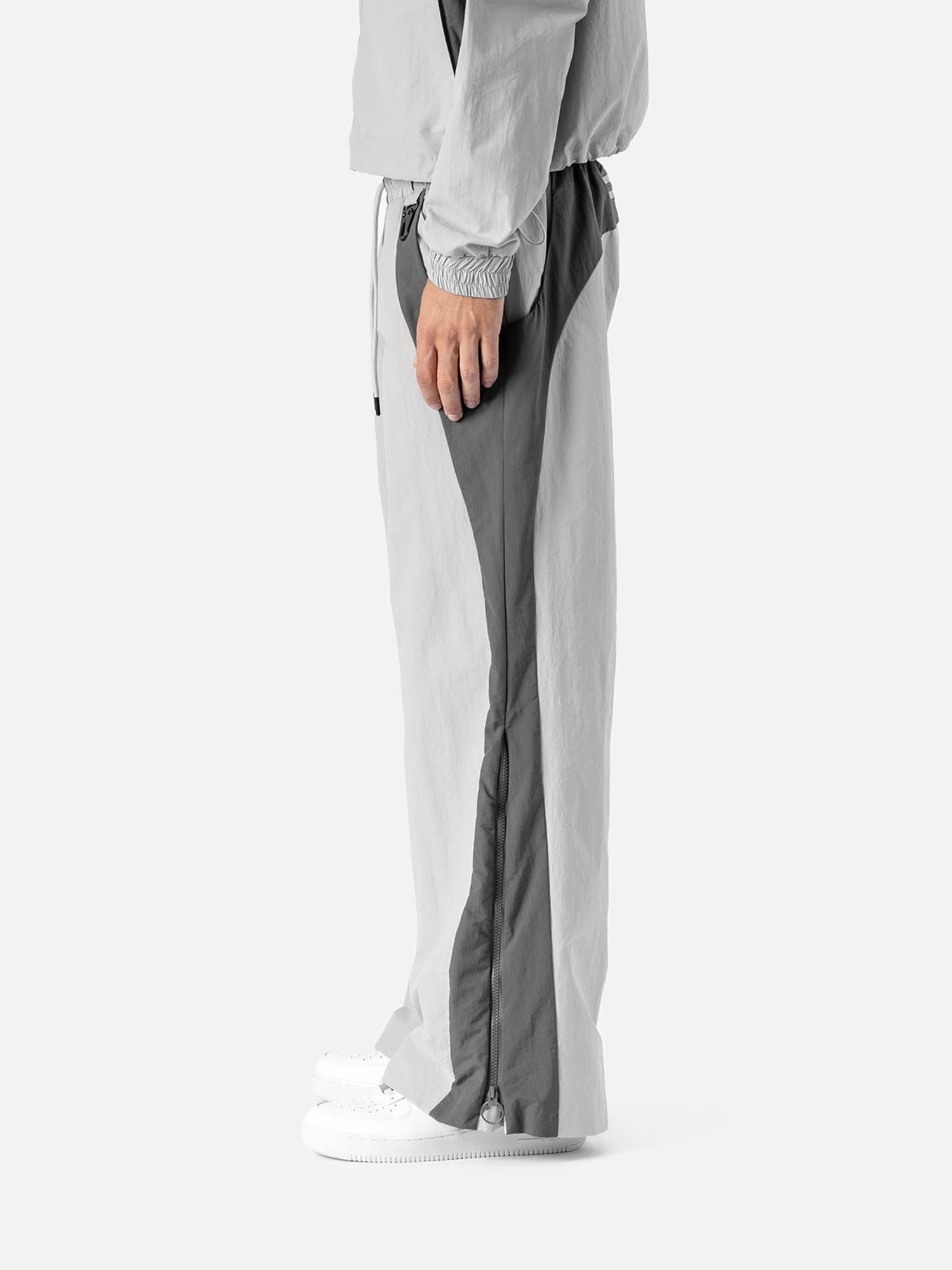 • Side view of a light grey with grey side panels track pants , decorative buckle at the waist, matching jacket, and white sneakers.