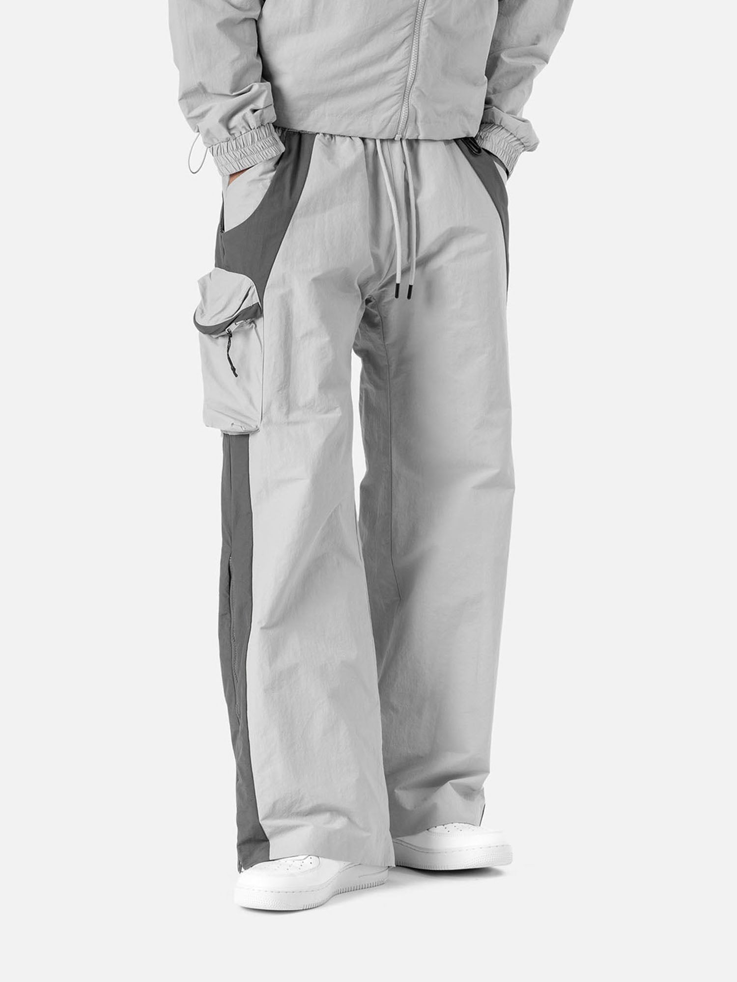 • Back view of a light grey with grey side panels track pants, side pocket on the right side, zip pocket at the back, matching jacket, and white sneakers.