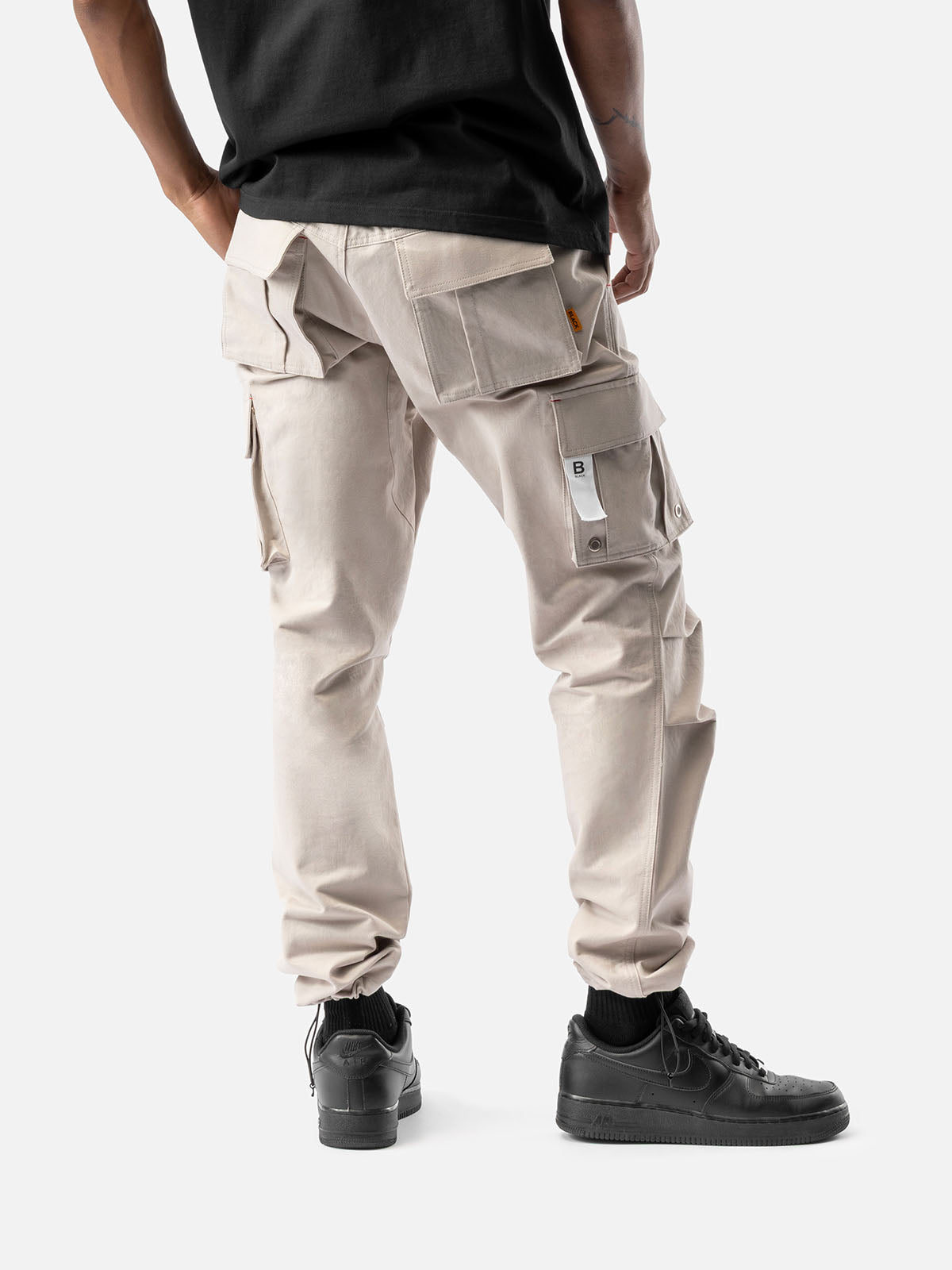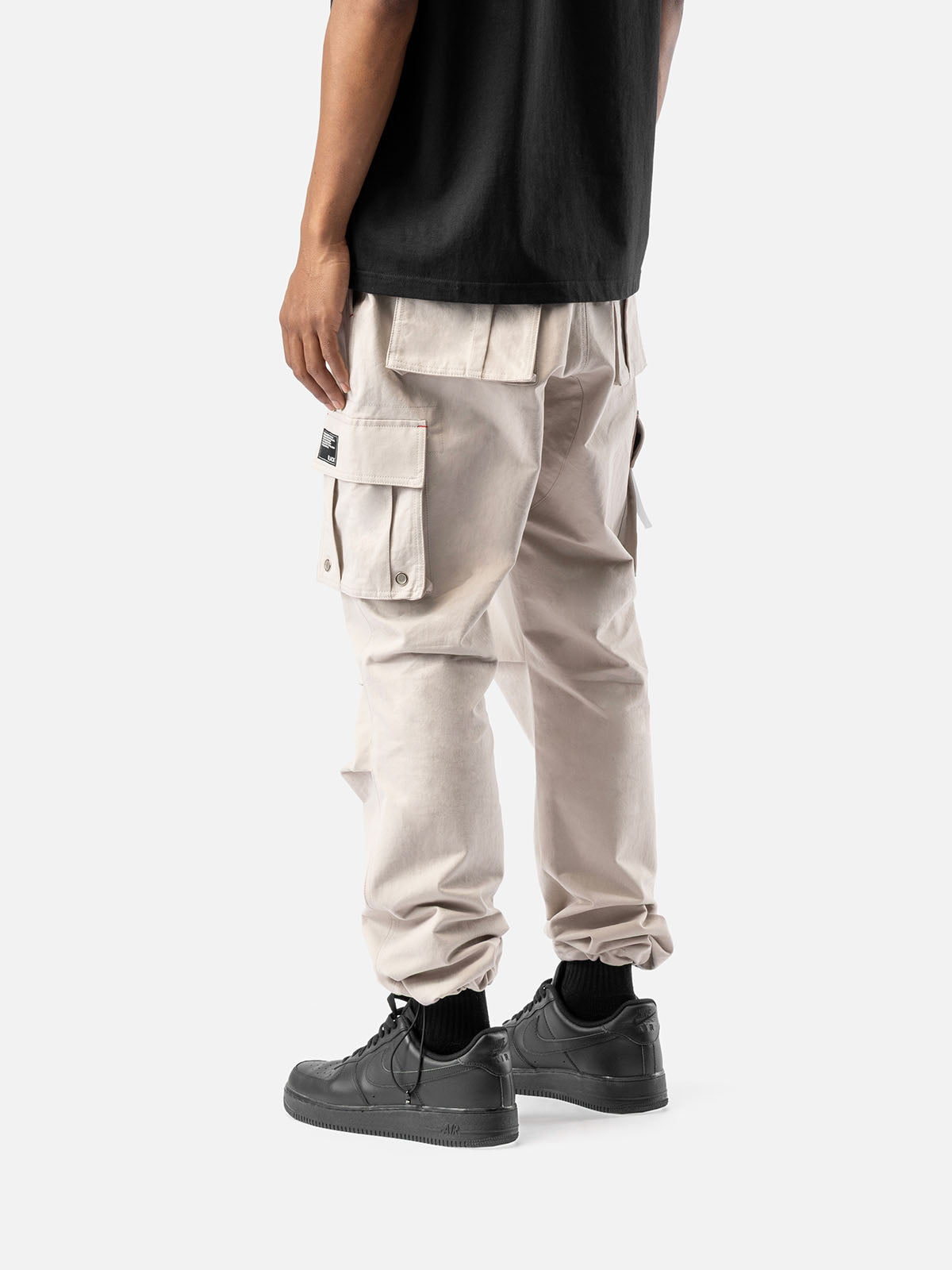 • Side view of rock cargo pants with side pockets, ankle drawstrings, paired with a black t-shirt, and black sneakers.