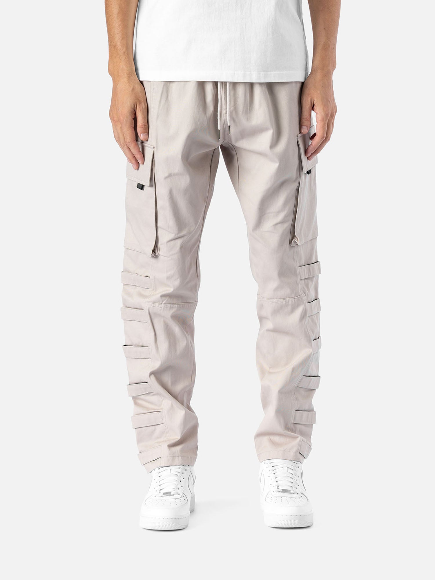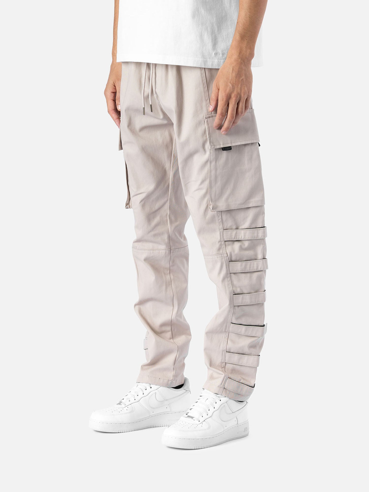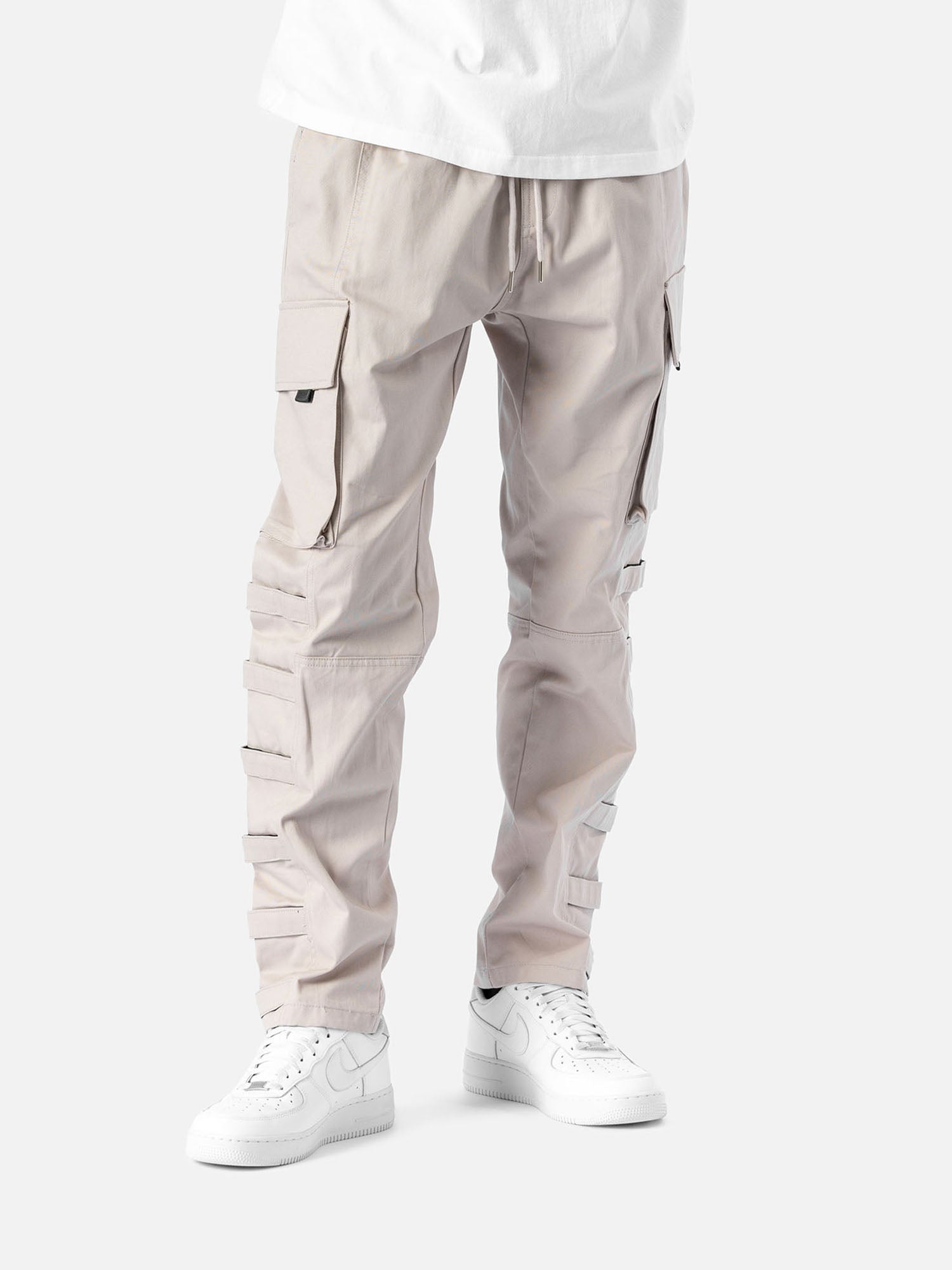 Khaki cargo pants with side pockets, ankle drawstrings, paired with a black t-shirt, and black sneakers, showcasing streetwear style.