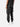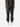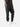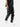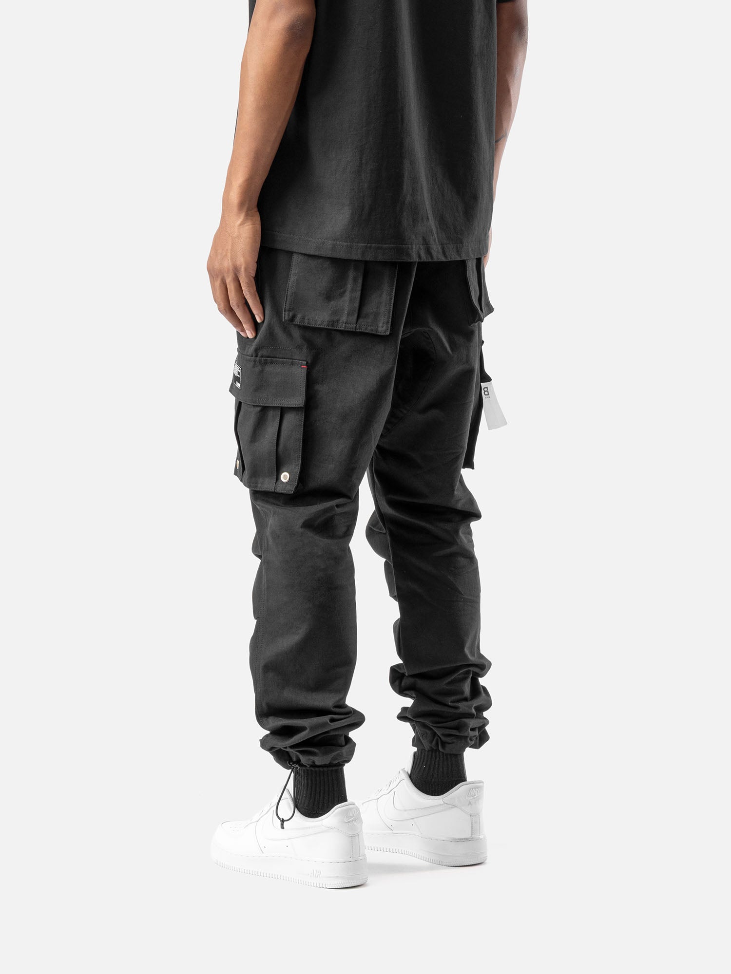 • Side view of black cargo pants with side pockets, ankle drawstrings, paired with a black t-shirt, and white sneakers.