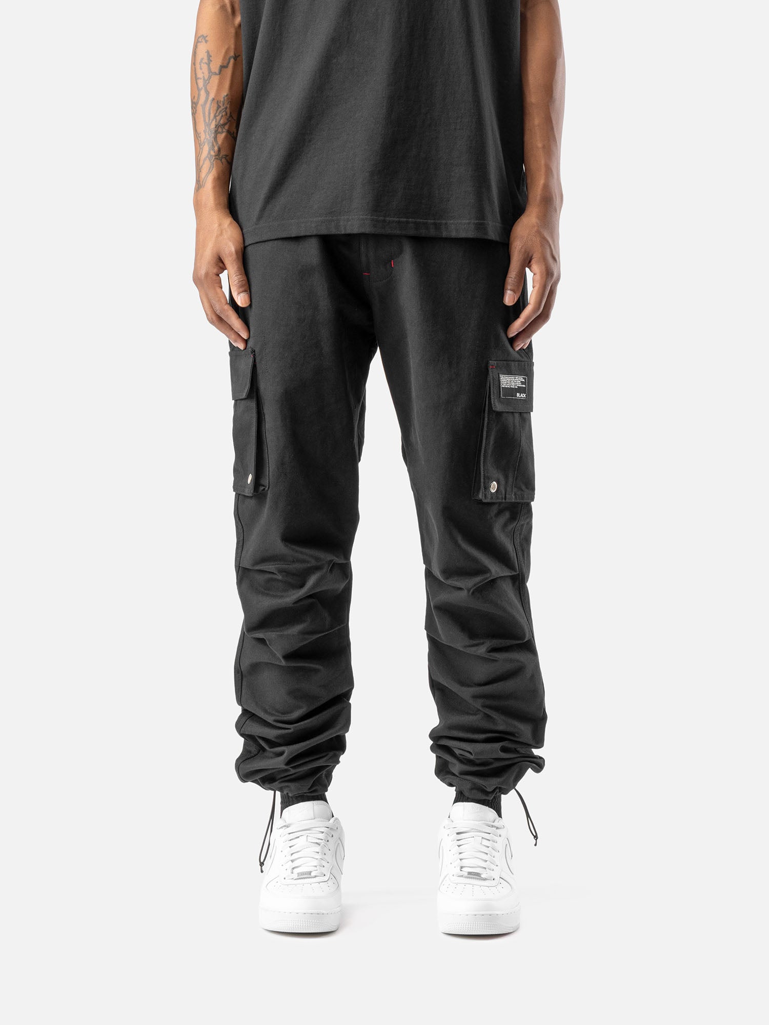 • Black cargo pants with side pockets, ankle drawstrings, paired with a black t-shirt, and white sneakers, showcasing streetwear style.