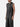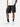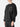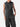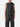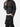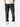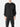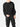Black with white side panels track pants, with side pocket on the right side, decorative buckle at the waist, matching jacket, and white sneakers.