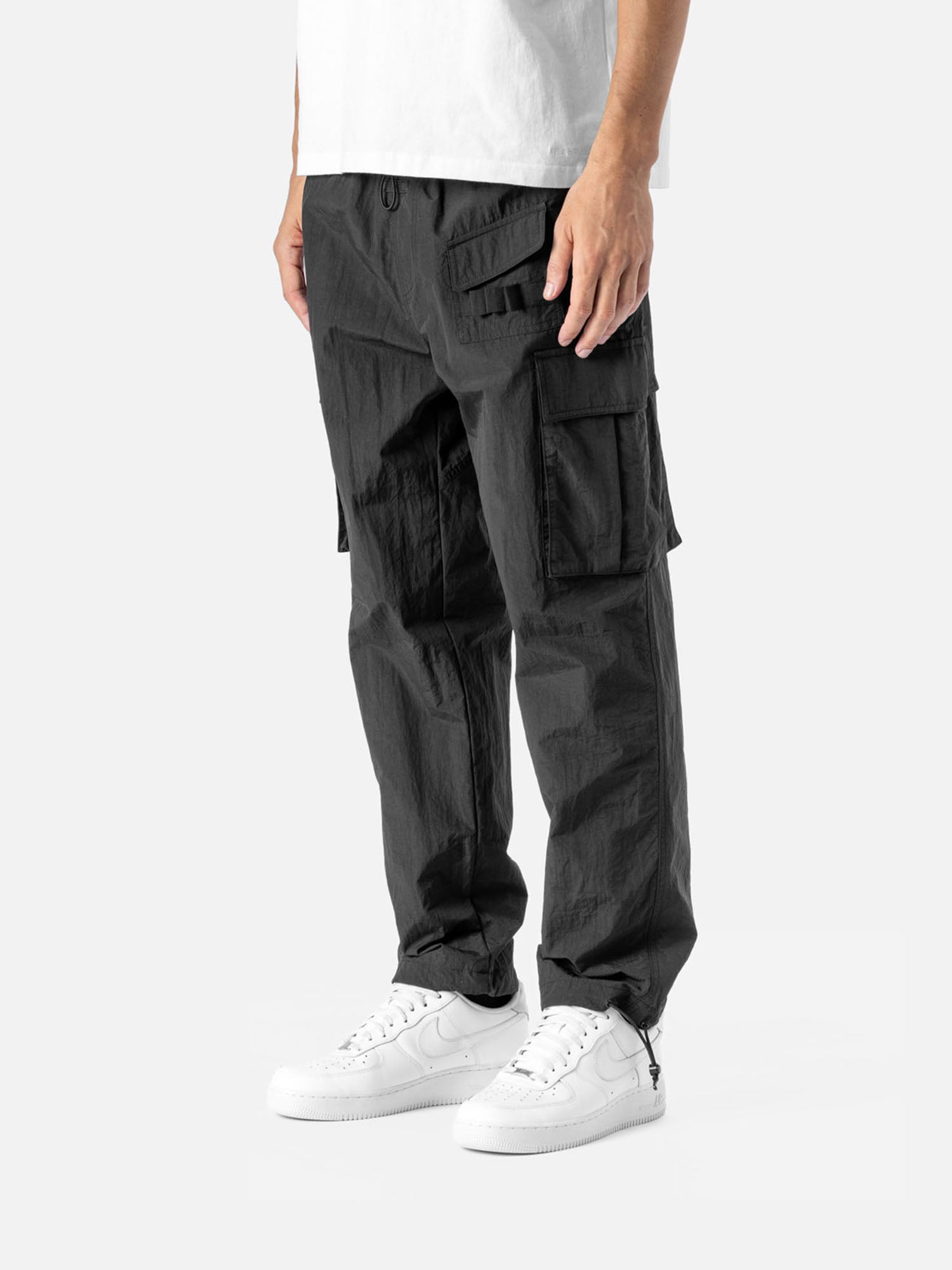 Black cargo pants with side pockets, ankle drawstrings, paired with a black t-shirt, and white sneakers, showcasing streetwear style.