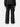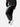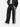 • Side view of a black with white side panels track pants , decorative buckle at the waist, matching jacket, and white sneakers.