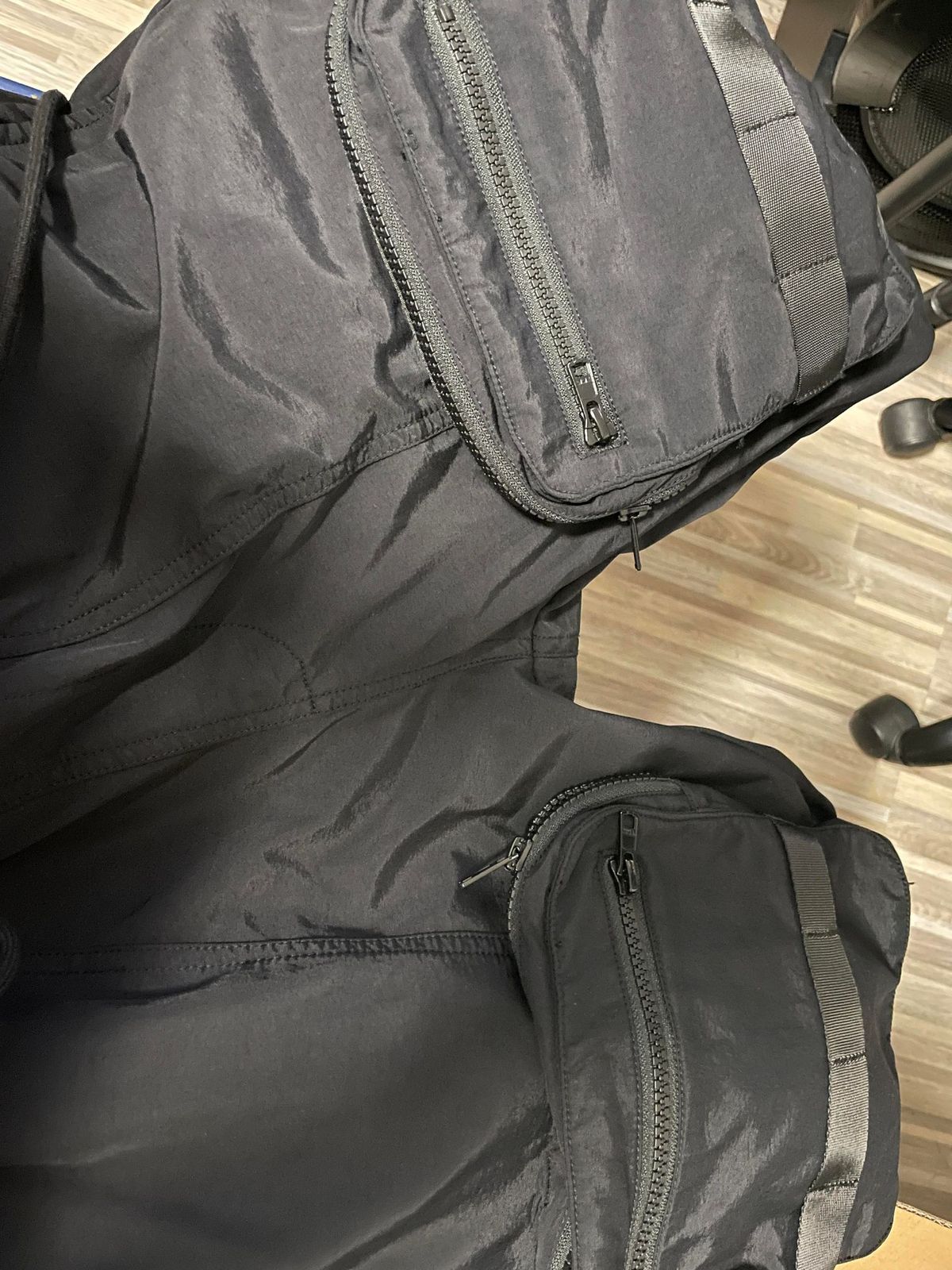 Very thin fabric, decent quality. Feels very plastic-y, and the pockets don’t bend around the legs; they instead stick out to the sides. Very easily adjustable at the top and bottom with built-in straps.